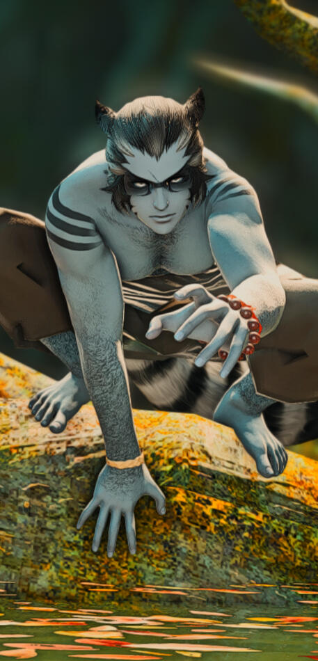 Gr'a's tail is large, poofy, and banded gray and black. His chin is scratchy with stubble, and the area around his eyes is darker than the rest of his skin like a bandit mask. Has a small scar between his eyebrows.